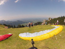 Gestartet wird auf den sanfte Wiesen der Kampenwand. Der Startplatz liegt auf 1430 m und ist von der Bergstation der Kampenwandbahn in einer Minute zu Fuß zu erreichen. Nach einer ausführlichen Einweisung zum Tandemstart, wird das Passagiergurtzeug und der Helm angepasst. Danach erfolgt die gemeinsame Vorbereitung auf den Tandemstart.