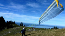 Der Pilot zieht den Gleitschirm auf, nach nur wenigen Schritten heben wir ab und können das Erlebnis Tandemfliegen gemeinsam genießen. Sanft vom Hang abgehoben sitzt der Passagier ganz bequem vor dem Piloten und kann so wunderbar die Majestätische Aussicht bestaunen.